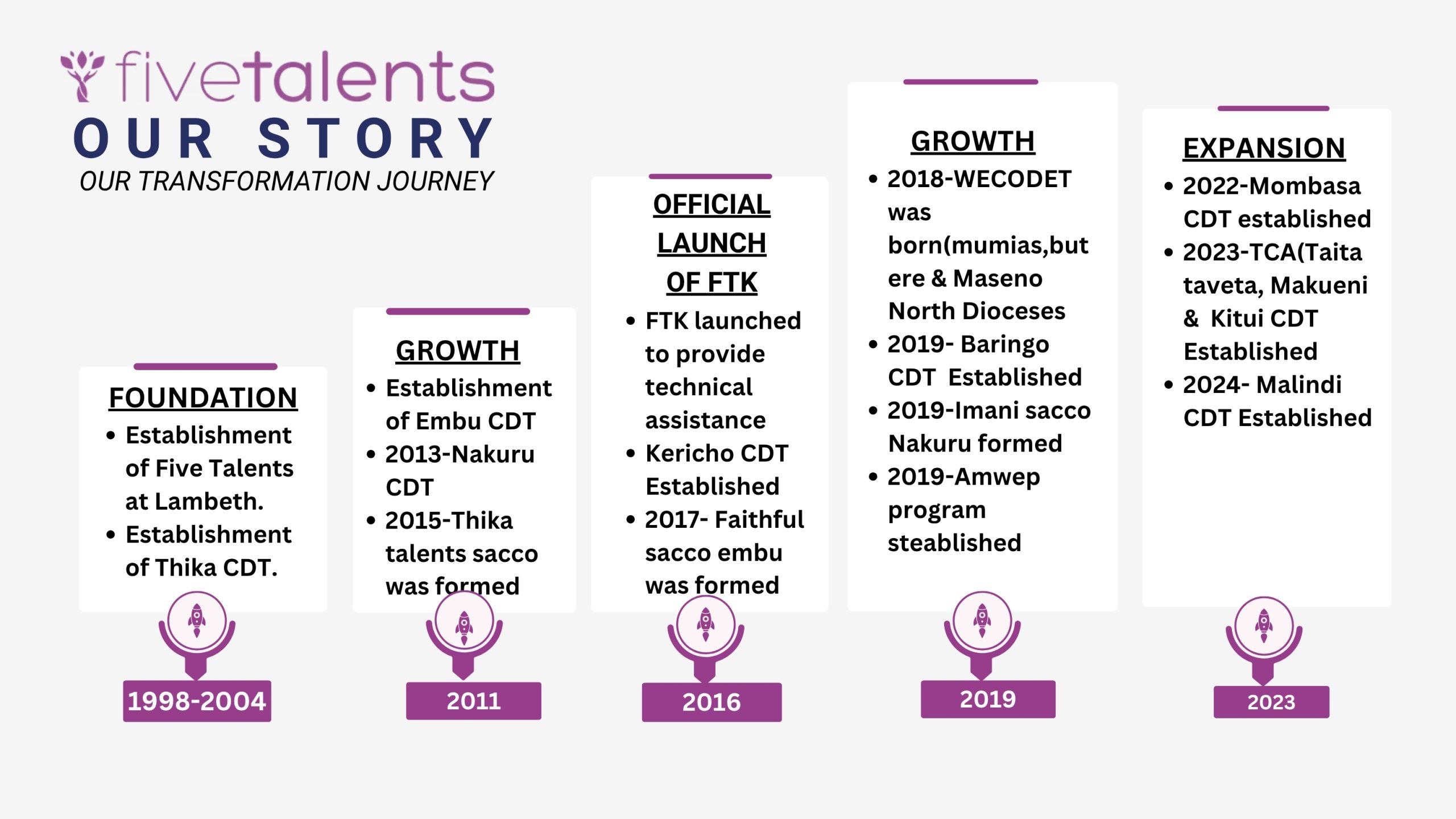 Through a strategic partnership with the Anglican Church of Kenya, Five Talents Kenya is currently active in 15 dioceses across the country. These include: Thika, Embu, Nakuru, Kericho, Baringo, Marsabit, Mombasa, Kitui, Makueni, Taita Taveta, Maseno North, Butere, Mumias (under WECODET), Malindi, and the recently onboarded Upper Southern Nyanza Diocese.Our work spans 22 counties, reflecting a growing national footprint and a deepening commitment to community transformation.